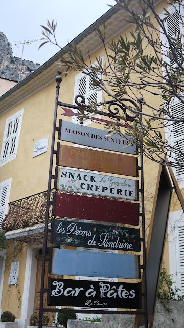 由於我們手邊並沒有準備任何Moustiers小鎮地圖,僅有的資訊是從數個格複製貼上的幾段文字描述,因此我們還真的沒有把握在白晝預備離場且天色更形曖昧不清的時刻,就單憑手上的自製指南、或是小鎮巷弄口所立起的標示牌,找到我們試圖遵循格友經驗推薦的Clerissy餐廳,根本是mission impossible,而也更尤其這個時候我們已是視茫茫地難以找到Moustiers最特色的兩懸崖小金星。