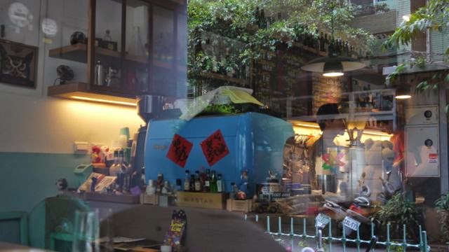 | 不過帶著大推車的我們不宜擠入窄店裡,於是識趣的戶外小院座而坐。 這裡隔窗往店瞧 |